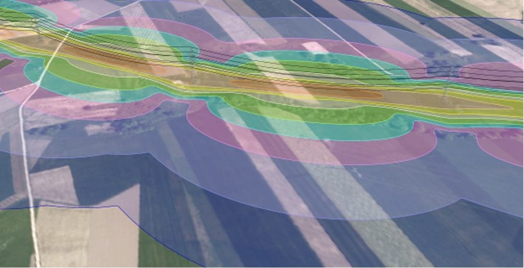 Predstavitev območij, kjer so presežene mejne vrednosti, je za različne daljnovode predstavljen v nadaljevanju. Na slikah so z rdečo barvo prikazana tista območja v prostoru, kjer so presežene mejne vrednosti za II. območje varstva pred sevanji ter z zeleno tista območja, kjer so presežene mejne vrednosti za I. območje varstva pred sevanji. Iz slik je razvidno, da se s spreminjanjem oddaljenost vodnikov od tal spreminja tudi območje, kjer so presežene mejne vrednosti (Gajšek et al., 2016).